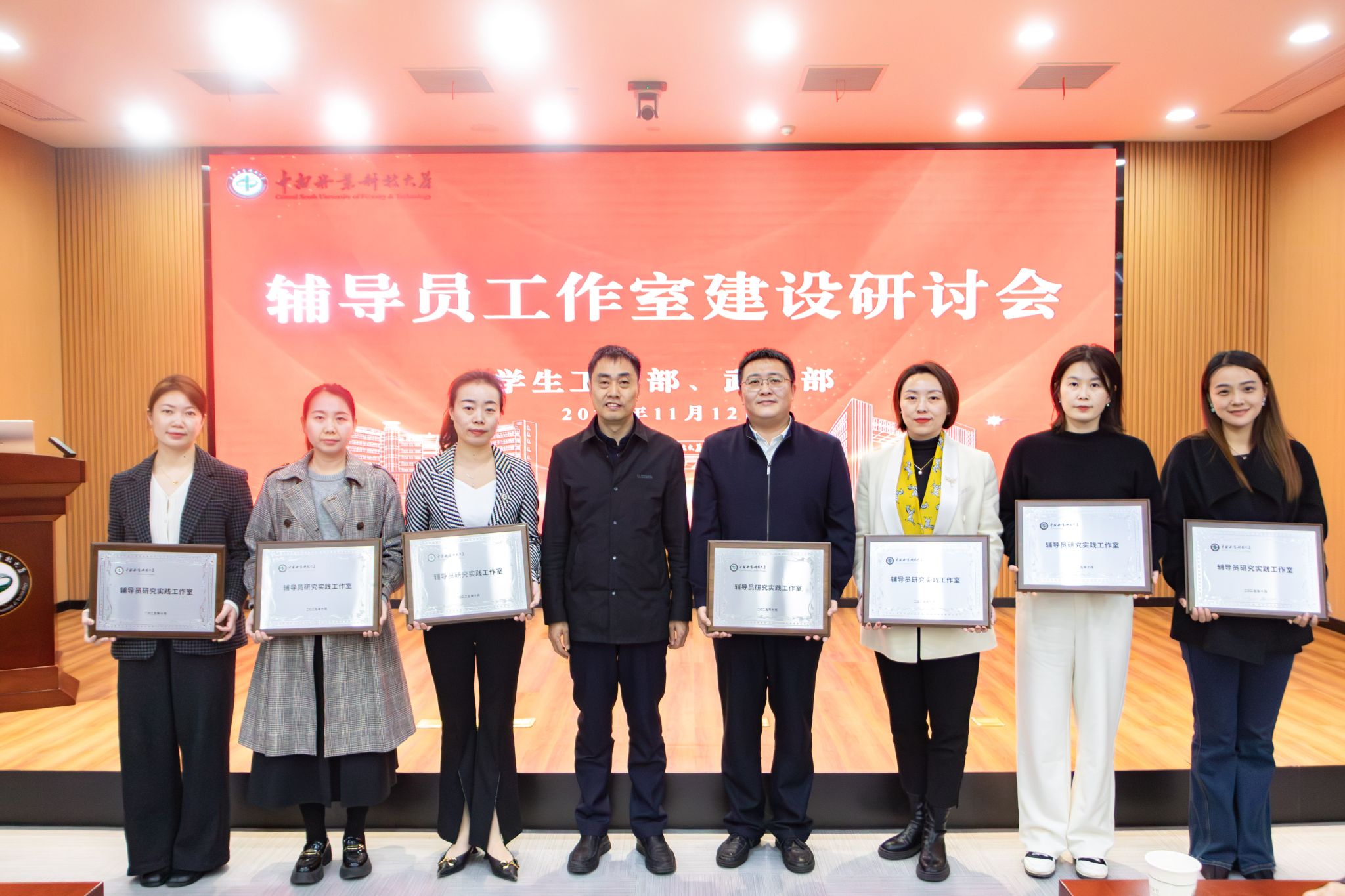 会议宣读并授牌首批7个校级辅导员研究实践工作室,工作室以“育人能力提升”为主线,致力于构建“前辈领航+朋辈互助+同行交流”的成长共同体和协同育人平台,涵盖生涯教育、创新创业、数智思政、生态文明教育、党团与班级建设、学风建设、网络思政等多个领域。