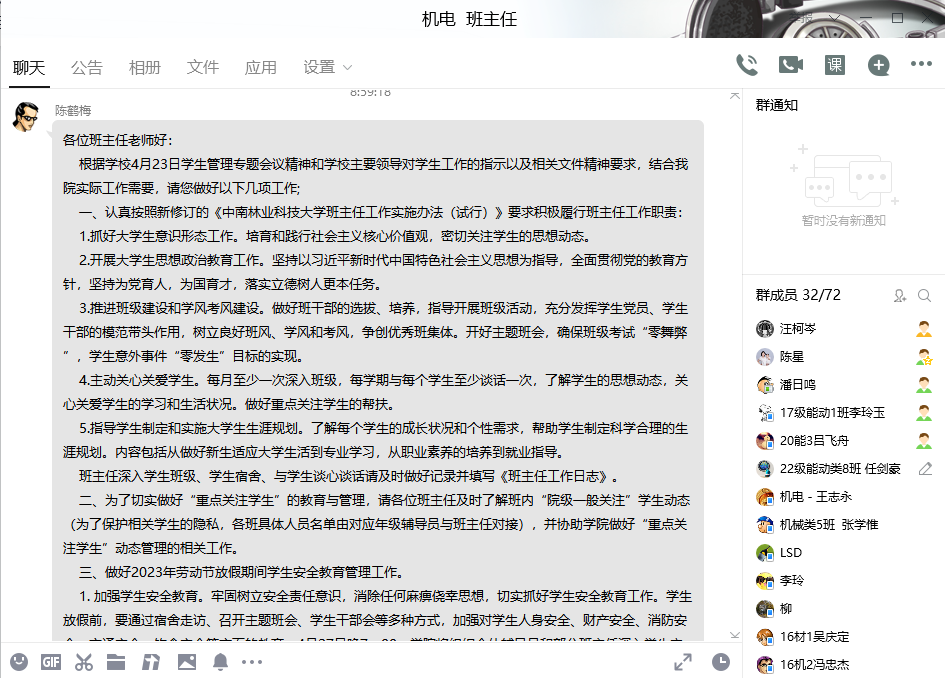 会议要求,全体班主任应认真按照新修订的《中南林业科技大学班主任工作实施办法(试行)》要求积极履行班主任工作职责。抓好大学生意识形态工作,开展大学生思想政治教育工作,推进班级建设和学风考风建设,主动关心关爱学生,并指导学生制定和实施大学生生涯规划。班主任应深入学生班级、学生宿舍、与学生谈心谈话请及时做好记录并填写《班主任工作日志》。