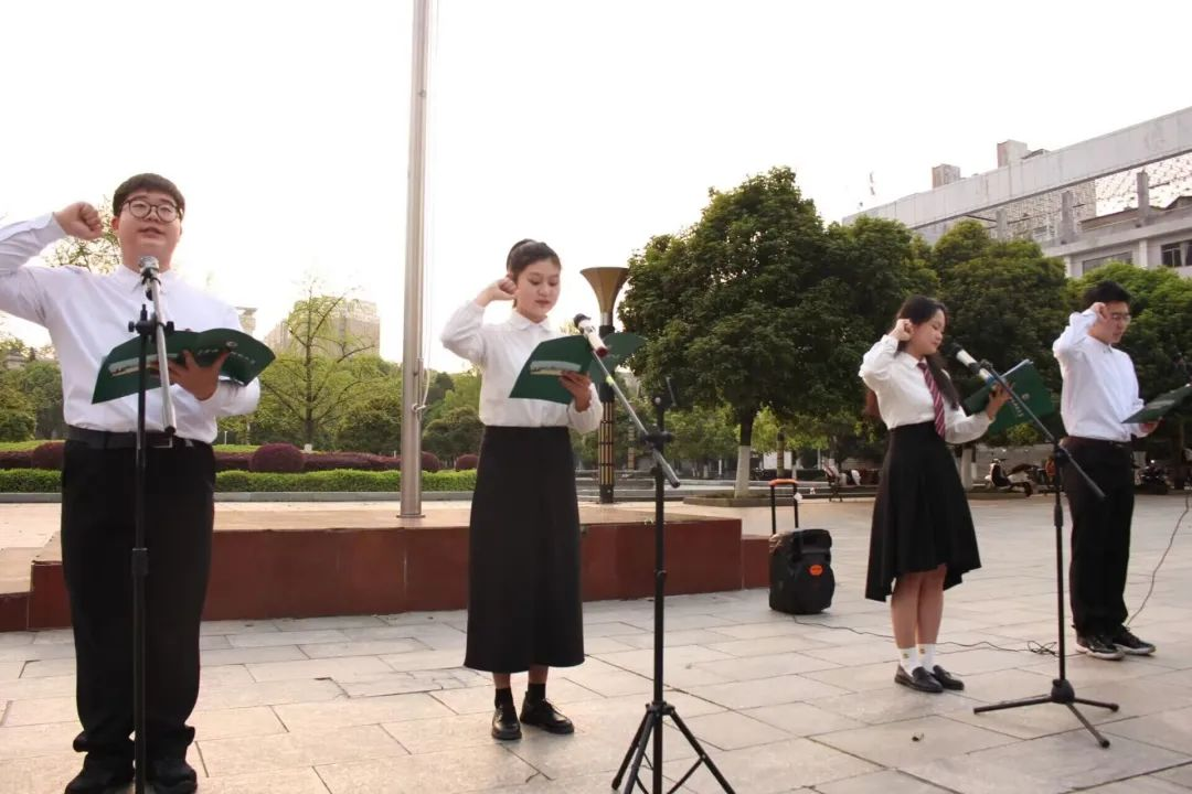 四位院朗诵队的成员通过朗诵讲述了新中国奋斗的历史,以掷地有声的朗诵展现了青年人的责任与担当,朗诵完毕,朗诵队员带领全体师生进行庄严宣誓。