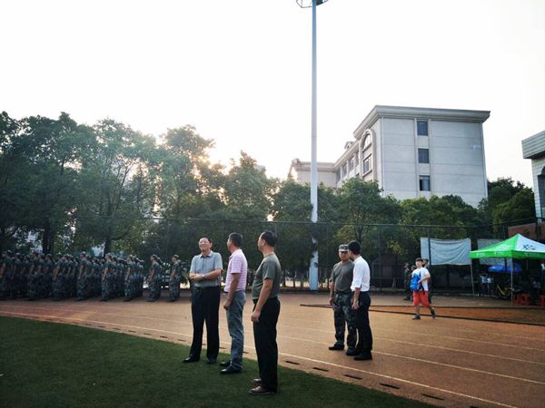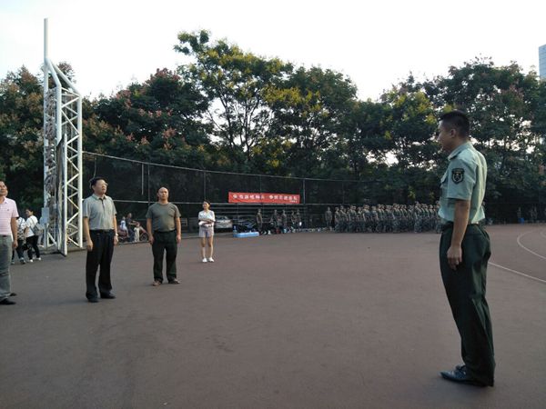 首先由军训团副参谋长赵珊向陈校长进行上报,之后陈校长在军事科科长欧阳达、保卫处处长张先勇及教官代表的陪同下,到军训各个方队队伍前进行视察。军事科科长欧阳达对本次军训的训练情况进行了详细的讲述,17级新生训练热情高涨,训练紧张有序,纪律严明,队列动作达到了比较高的水平,其中表现较为突出的是独立连的两个方队:一方队和二方队。