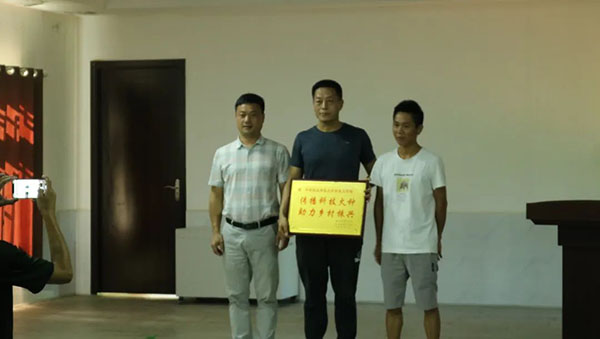 结课汇演前塘口村副书记周坤堤、塘口学校校长方健康授予中南林业科技大学学生工作部“传播科技火种,助力乡村振兴”的牌匾。